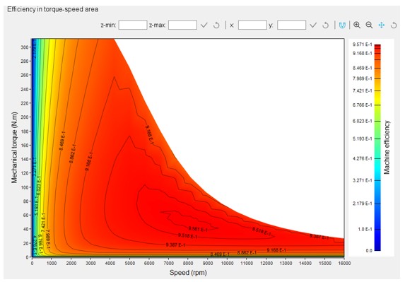 In the results, the performance of the machine at the base point (the base speed point) and for the maximum speed set by the user are presented. A set of curves (like Torque-Speed curve) and maps (like Efficiency map) are computed and displayed.
