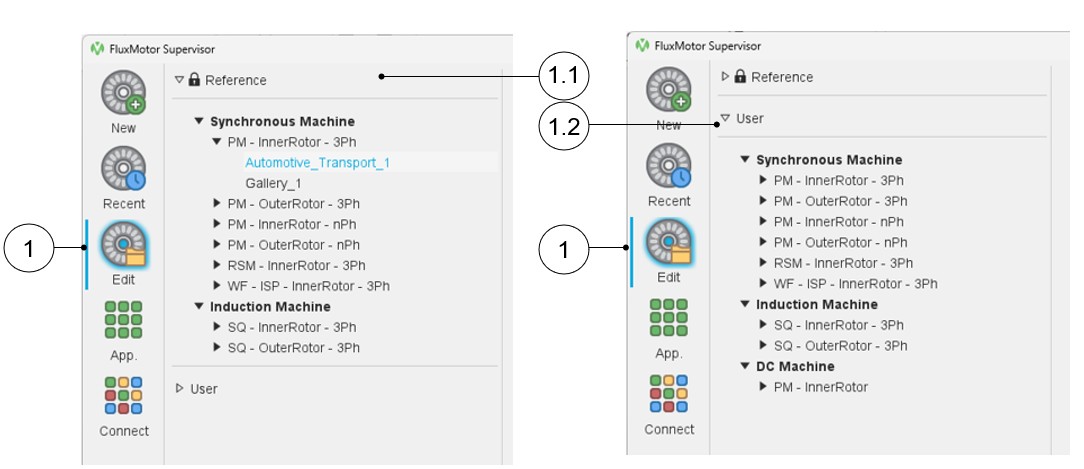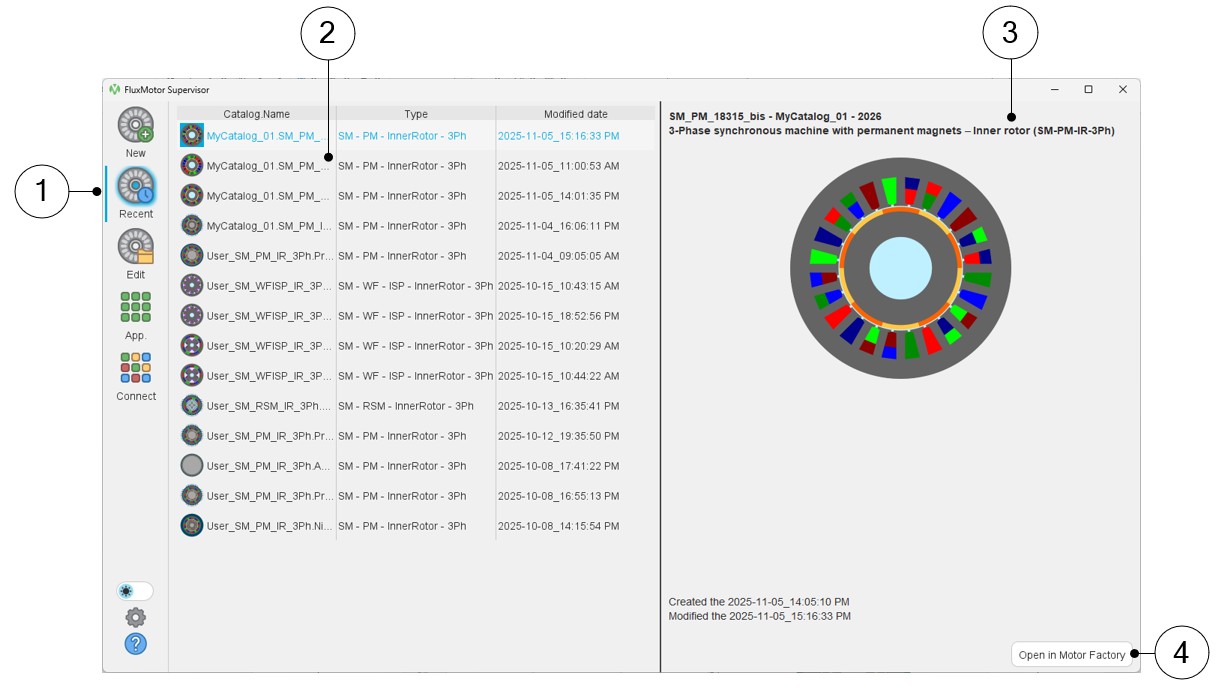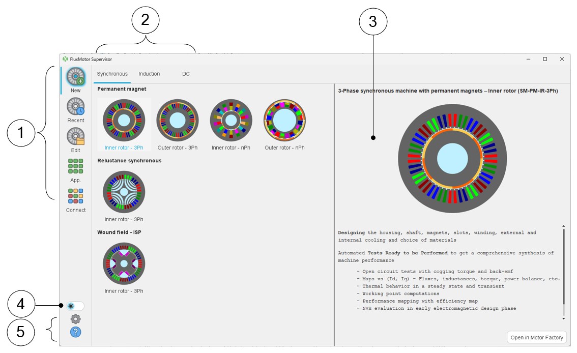 | 1 | Main entry points of the supervisor – New motor in Motor Factory, edit a Recent motor, Edit a motor from catalogs, Open FluxMotor satellite Applications, and Open Altair® solutions. |