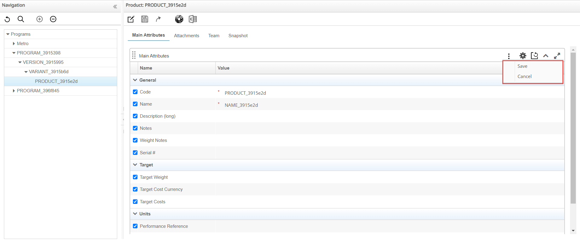 Attribute Management is available at the Program, Version, Variant, and Product levels. You can modify the visualization of the Main attributes and categories inside dashlets. WA allows you to modify each attribute position by moving it inside the same category or to another category and to switch its visualization on or off.