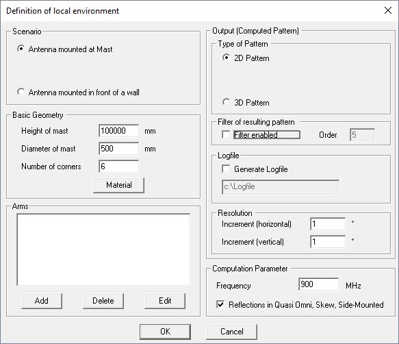 MASC supports antennas mounted at masts as well as antennas mounted in front of walls:Figure 1. The Definition of local environment dialog.