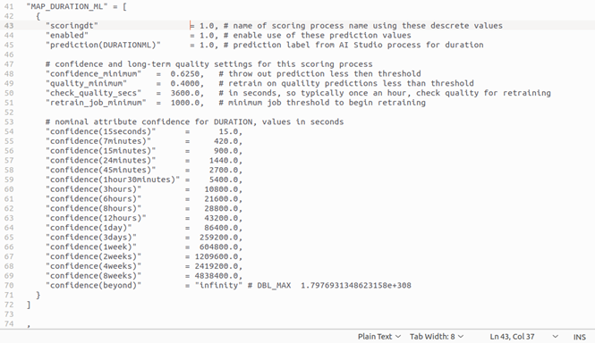 prediction(DURATIONML). If you call your prediction attribute something other thanDURATIONMLyou must rename the corresponding attribute in the vovrtsad.cfg file. The scoring process name is only used for reference. The remaining values are used by the vovrtsad daemon or nc_rtsa wrapper for various things. Use theconfidence_minimumvalue as the threshold that must be met apply a prediction value, such as 0.6250 in this example. Thequality_minimumvalue is used for retraining; in this example it is set to 0.4000. The frequency the daemon checks for potential retraining is set viacheck_quality_secsin terms of seconds, so once an hour in this example. Finally,retrain_job_minimumis used to set a minimum threshold of completed jobs monitored by the vortsad daemon before it will permit model retraining. -
