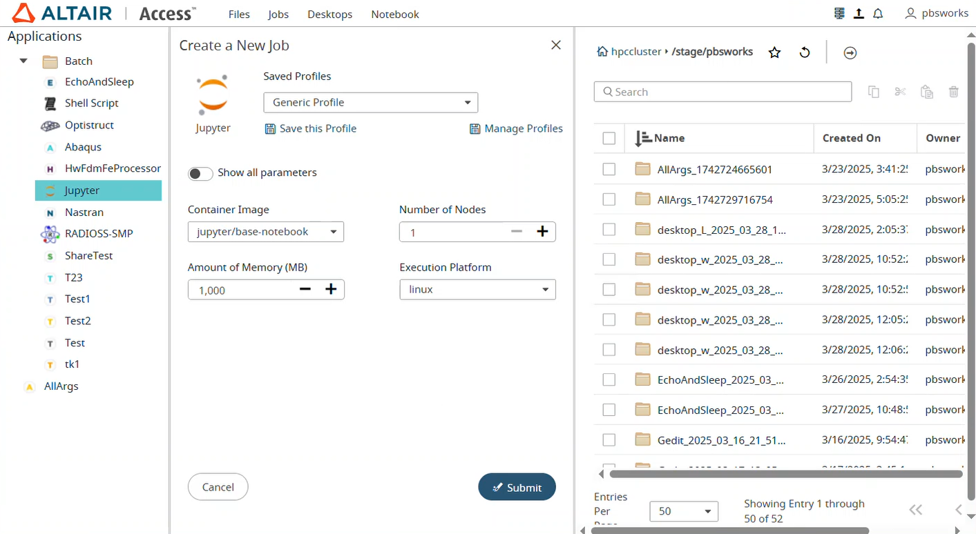 - Center pane - Displays the Job Submission Form. First time when you select an Application, Generic Profile is selected and subsequent time Last Submitted profile is selected. Profiles are displayed in a drop-down list next to the application.