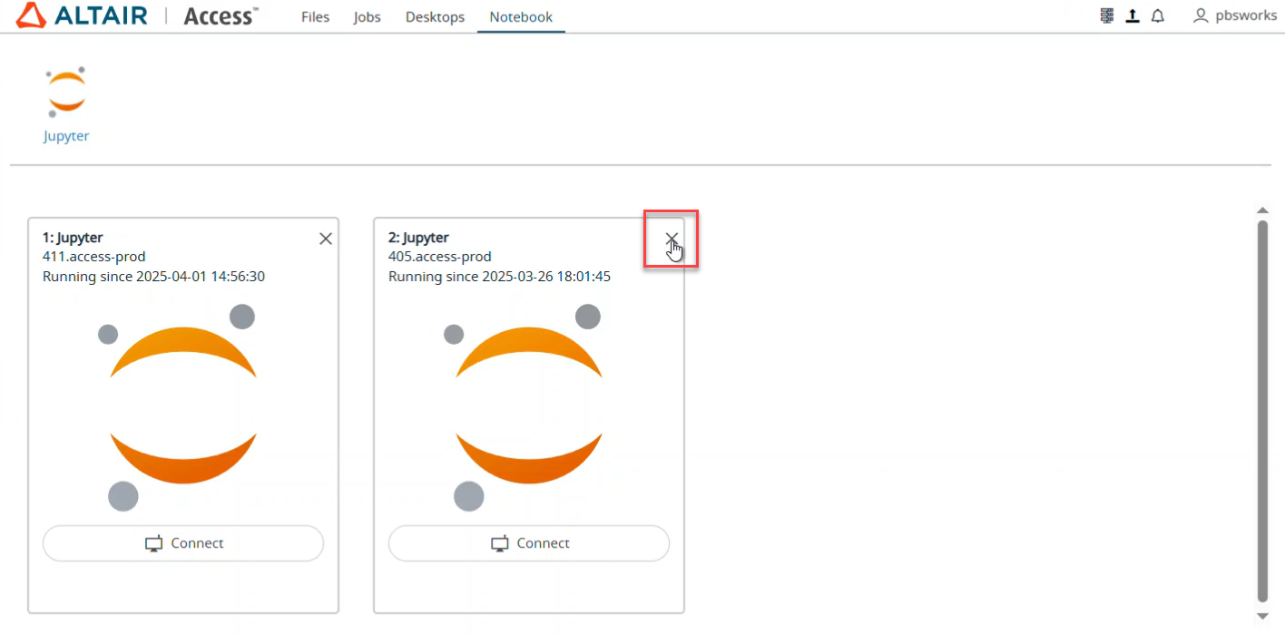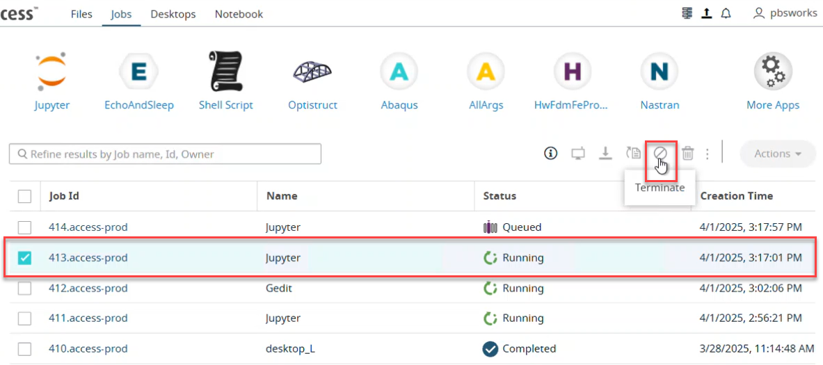 selecting the Jupyter Notebook session and clicking .Figure 5. Terminate Jupyter Notebook Session from Jobs Tab