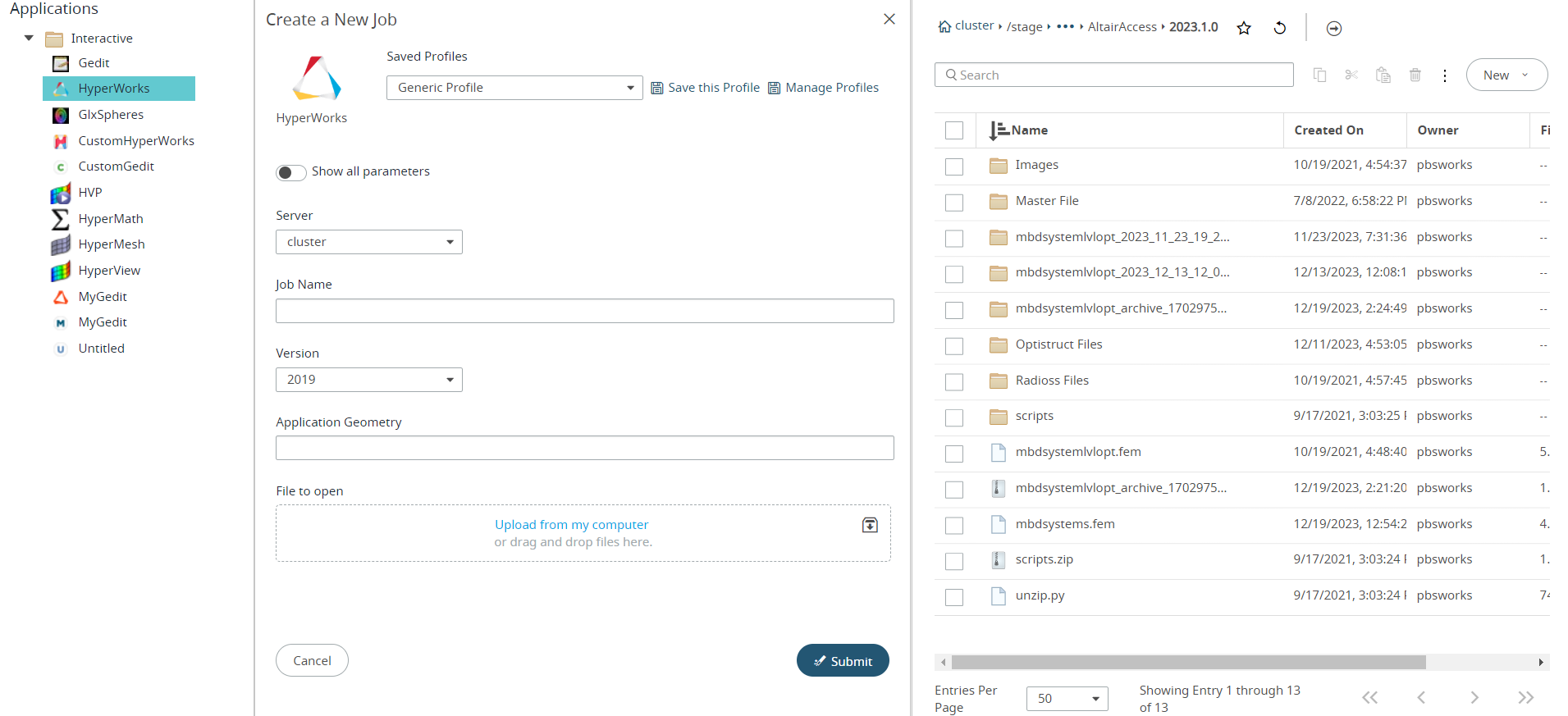 - Center pane - Displays the Job Submission Form. First time when you select an Application, Generic Profile is selected and subsequent time Last Submitted profile is selected. Profiles are displayed in a drop-down list next to the application.