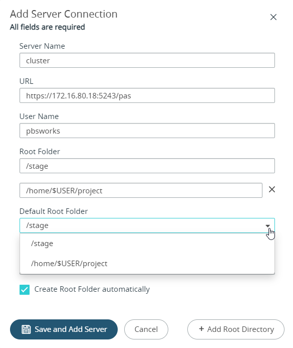 When adding a server cluster, the Autocreate Directory option is enabled and set to true. If the specified root directory does not exist in PAS, it will be created.