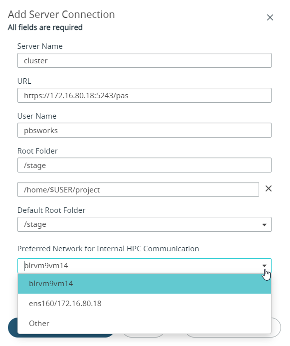 Administrators can use the Preferred Network for Internal HPC Communication field during cluster registration to select the network for communication between PAS and execution nodes to the Access Web portal. When multiple network cards with different bandwidths are available during cluster registration, administrators can choose the fastest network for better speed.