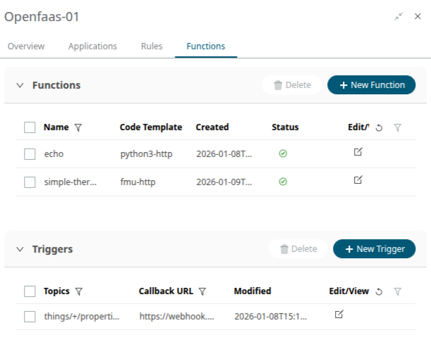 In the Functions tab you can manage Functions and Triggers as defined on the Edge Asset. The applications “App - ECP Functions Stack” and “App - ECP Support Functions” are required.