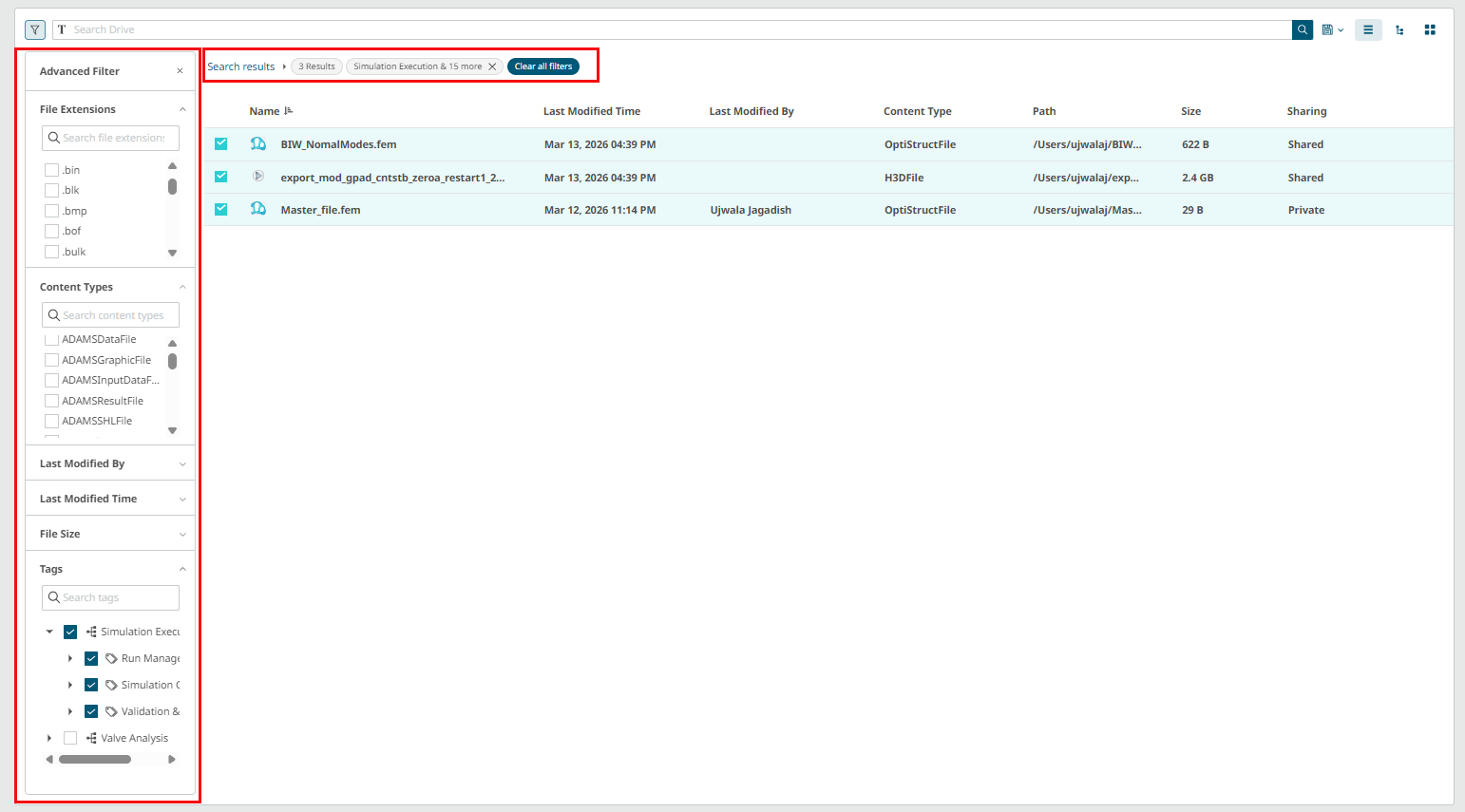 Select the required filter values. The application filters the files list automatically and the advanced search result is displayed. -