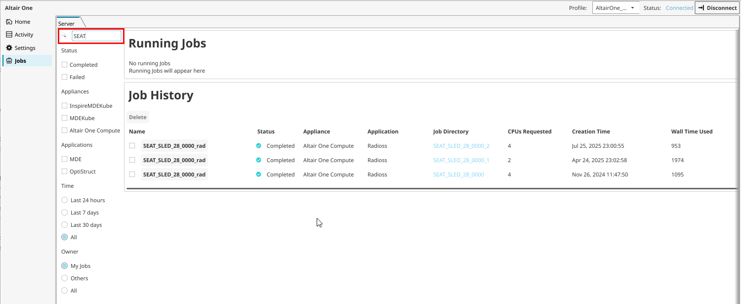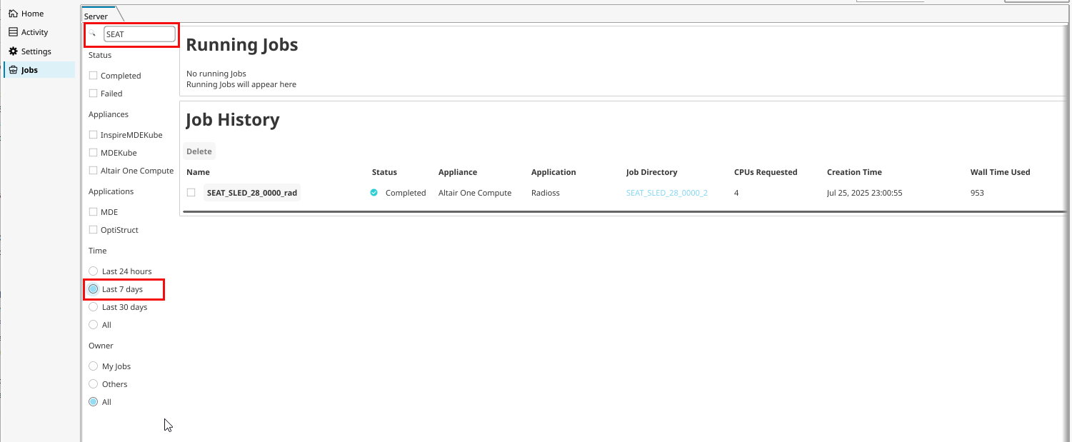 Search for a job by its name, status, appliance, application, or submitted date and time.