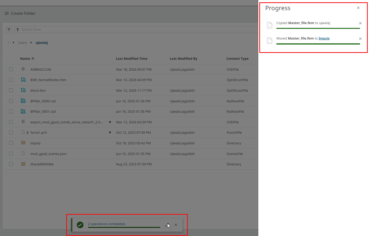The file is copied and then moved to the location selected. The notifications of these actions are displayed.