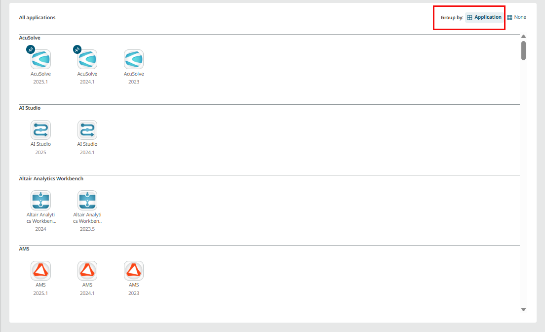 The Applications page allows you to browse and access various software applications by versions across Altair's suite of products.
