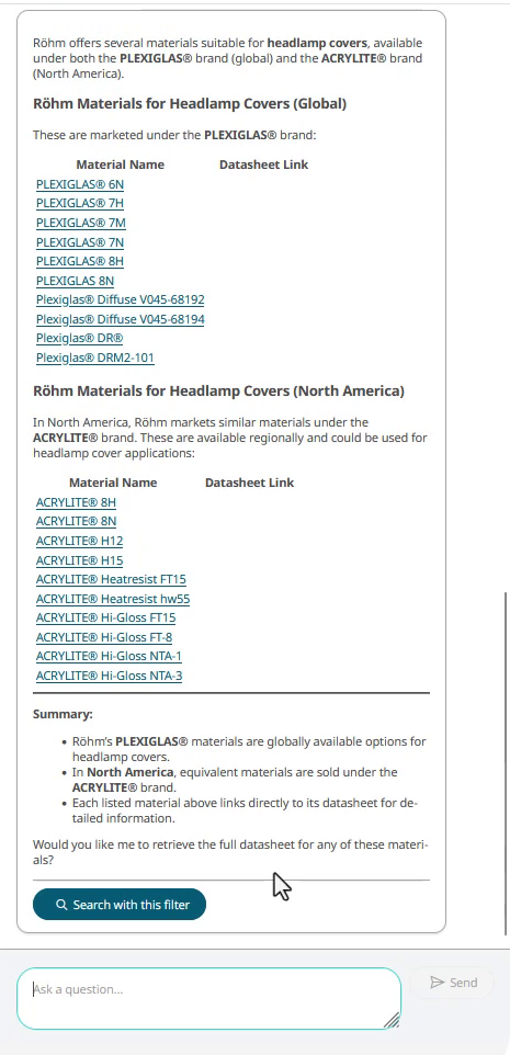 Yes, further options are provided.In this example, Materials Copilotsuggests Röhm Materials for Headlamp Covers available globally from PLEXIGLAS brand and in North America, Röhm Materials for Headlamp Covers under a different, ACRYLITE brand are displayed.Figure 4. Available Suggestions in Region