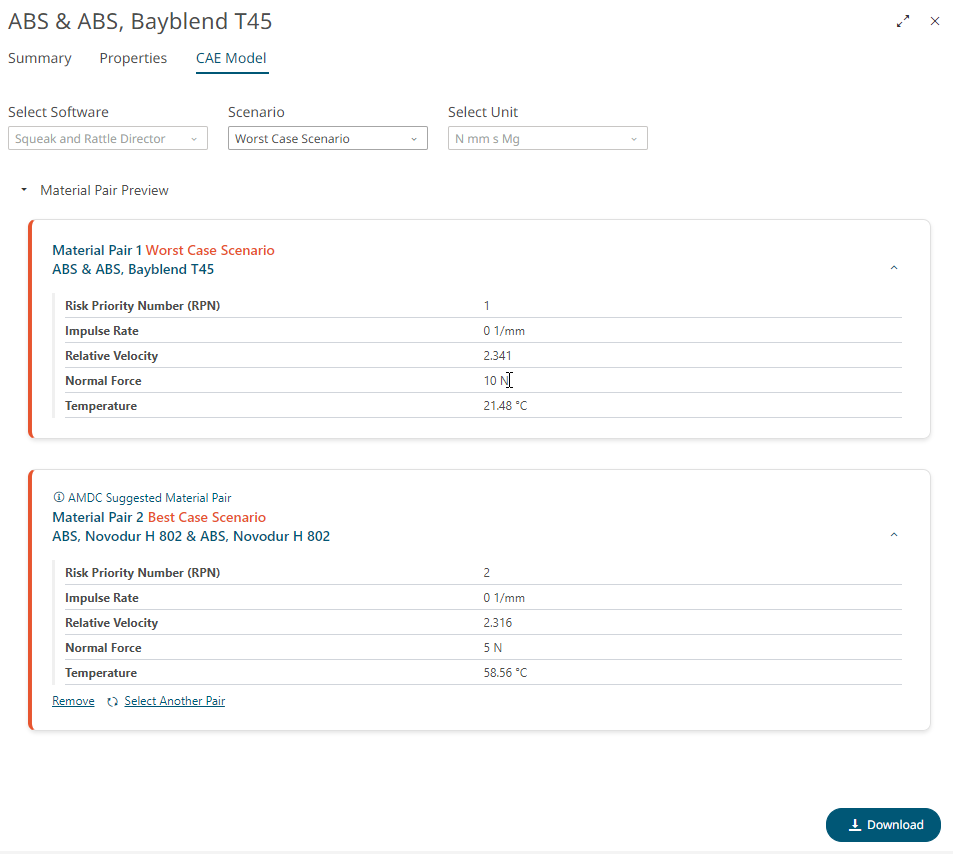 Click Download to export the material pair data as a