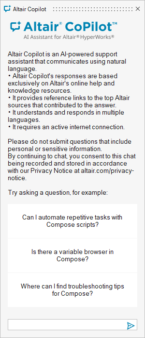 The list of topics from which answers are retrieved is automatically narrowed based on the active application and solver profile. For example, if you are using Inspire with the OptiStruct profile, Altair Copilot only provides answers related to either Inspire or OptiStruct.
