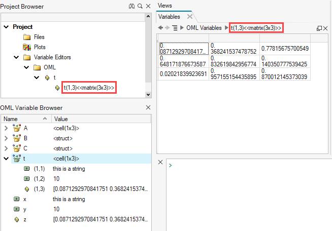 変数名<サイズ>として表されます。例えば、(1,3) のセル配列tが 3x3 の行列を含む子要素を持つ場合、子要素の名前はt(1,3)<matrix (3,3)>となります:- t(1,3)はセル配列の要素。