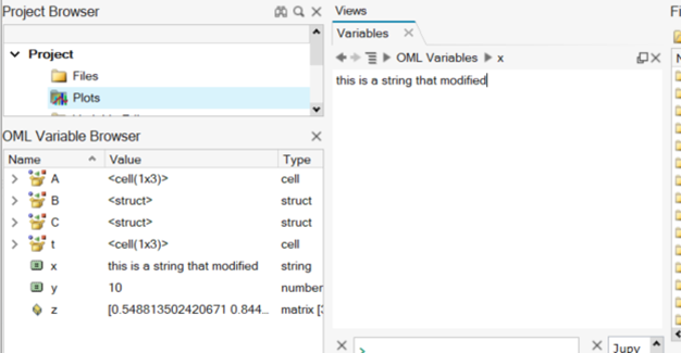 PlotsタブにはOMLとPythonの両方のプロットがあり、VariablesタブにはOML変数のみがあります。