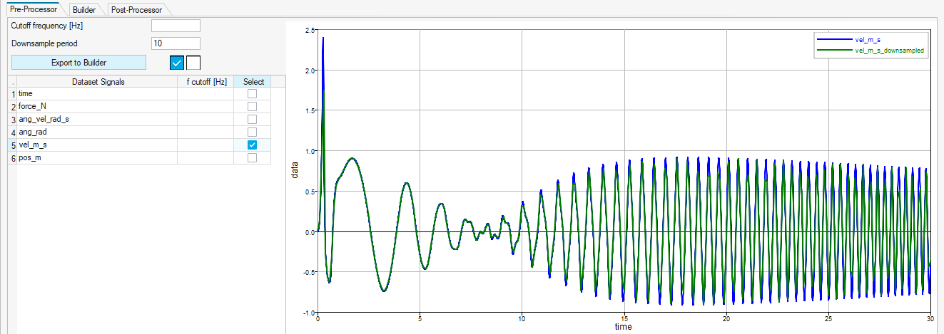 To filter a signal, enter the filter frequency in the f cutoff [Hz] column of that signal. The plot is refreshed automatically and shows the filtered and the baseline data.