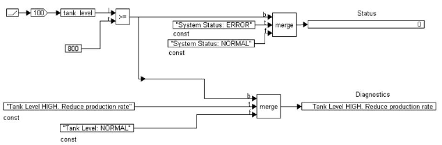 A tank level is monitored using two merge blocks and four const blocks. The top merge block tracks the tank level. The simulation operates normally until the tank level reaches or exceeds 800, at which point an error is displayed. The lower merge block indicates the necessary operator intervention.