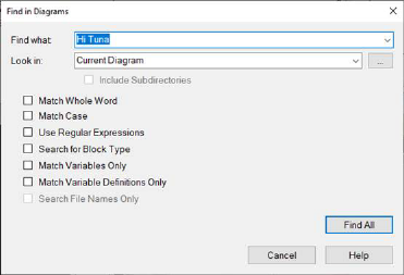 When you choose Edit > Find and Replace > Find in Diagrams, Embed displays a dialog to specify the block, identifier, or text string you want to find and the directories in which to search for it.