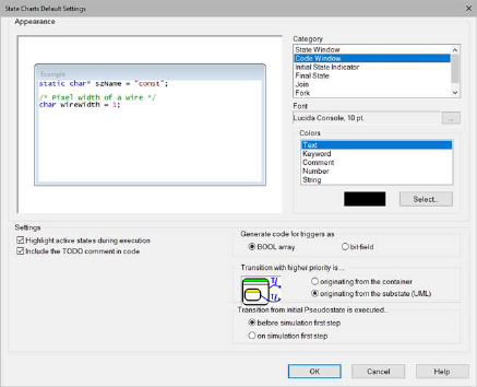 State Chart > Preferences controls the appearance of your state chart and defines default operations for your state charts.