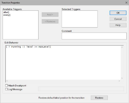 Edit Behavior: Defines the transition specification. It can contain triggers, a Boolean guard, and a behavioral expression.