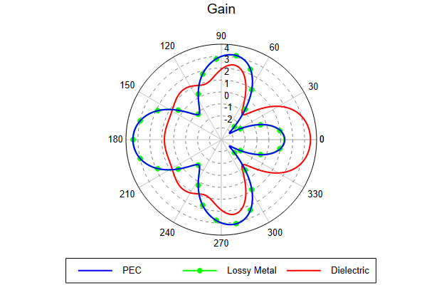 Compare the gain (in dB) of the requested far field patterns on a polar