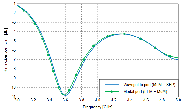 Figure 1. The input reflection coefficient of the DRA for both methods over the operating band.