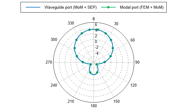 Figure 2. A polar plot of the vertical gain for the DRA at 3.6 GHz for both methods.