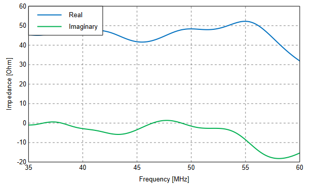 Figure 2. The input impedance (real and imaginary) of the LPDA antenna over the operating band.