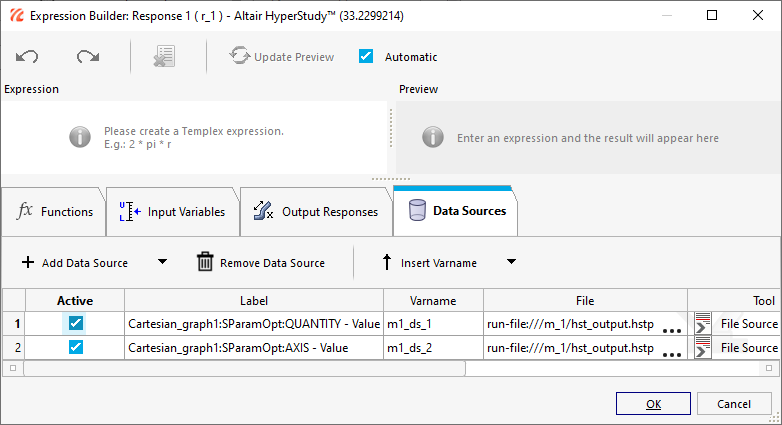 Note: The Data Sources m1_ds_1 and m1_ds2 is added from the POSTFEKO graph. - In the Expression field, enter max(m1_ds_1) and click OK.