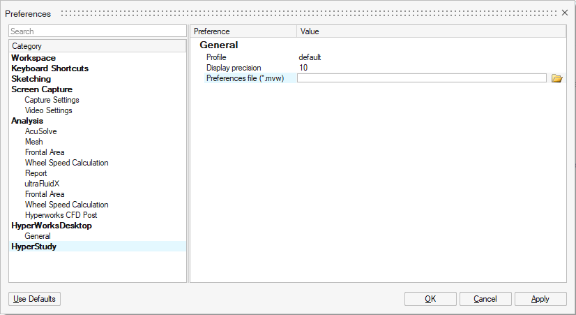 - [Optional]Select Create HyperStudy preference file to create a preference file with the correct solver path for the current installation.