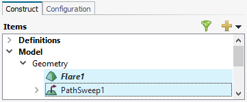 Figure 1. The Construction tab in the model tree showing the selected Flare1 and PathSweep1.