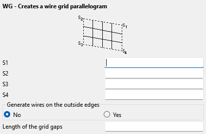 - Select No to create the wires inside the parallelogram only or Yes to generate all wires. This option is important when creating two adjacent parallelograms to ensure that the segments along the sides are not generated twice.