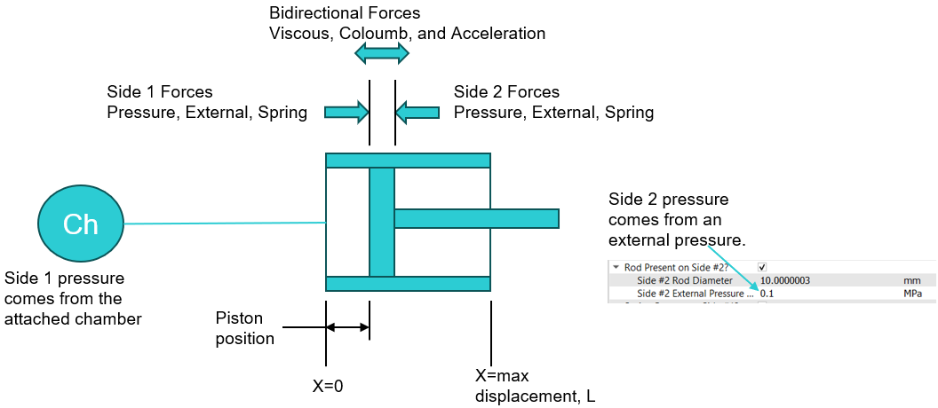 The coefficient which describes the level of leakage between the sides of the cylinder base and the walls of the element. The leakage flow is proportional to the pressure difference across the piston. For more advanced leakage modeling, you can use a separate flow element that connects the one side of the cylinder and the other. Note 1: If there are different materials on either side of the pistons, the leakage coefficient should be 0, because for example, oil should not leak into gas. For mixtures, please use a Custom Material definition. Note 2: Only for Double Acting Cylinder piston |