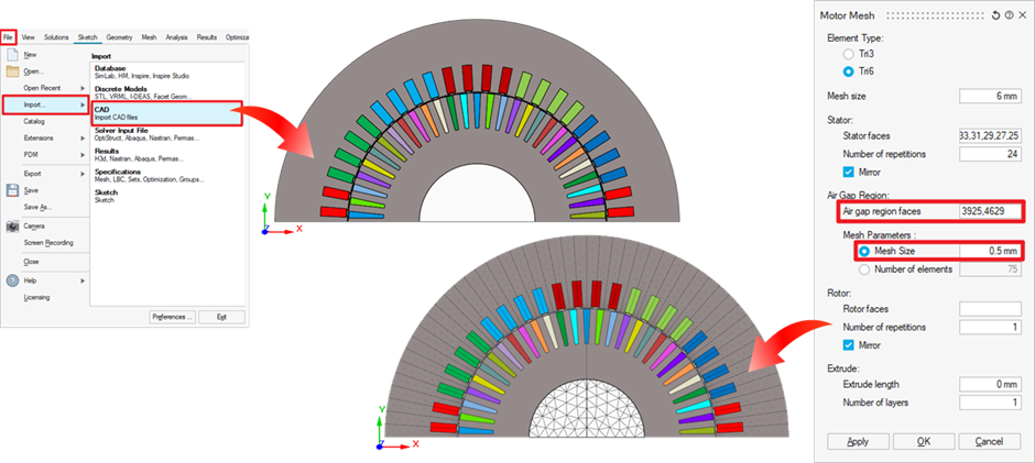 After importing the provided motor 2D CAD file (*.xmt_txt format), SimLab's Motor Mesh tool can easily generate a symmetrical mesh suitable for the 2D motor analysis.