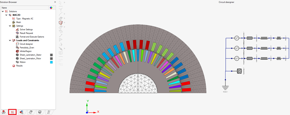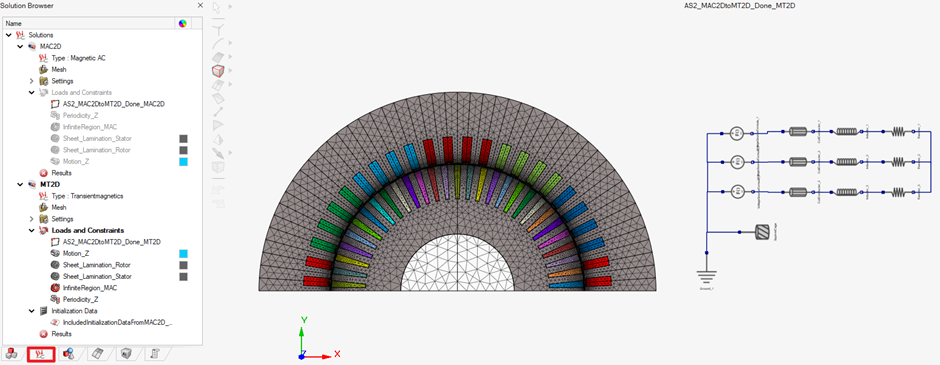 This tutorial first introduces how to use MAC2D solution to perform basic steady-state analysis of the motor and then uses DoE solution to obtain the motor characteristics with the parameter slip. Finally, the steady-state results will be used to initialize the transient simulation (MT2D solution) for a more comprehensive analysis.
