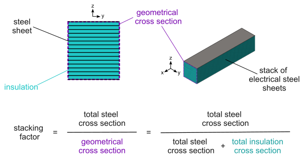 - the region is said to be laminated because it automatically accounts for the effect of the insulation of the electrical steel and for the small air gaps between the sheets in a stack. This is achieved through a homogenization procedure implemented in Flux. The overall effect of this homogenization is that the effective cross-section of magnetic material available for the magnetic flux to traverse in the region is reduced. The reduction factor is known as the stacking factor of the region, and corresponds to the total cross section area occupied by magnetic material (steel) in the stack divided by the surface area of the geometrical cross section of the same stack (i.e., the total cross section area, including the insulation and air gaps between sheets). This definition is illustrated in Figure 1 below.