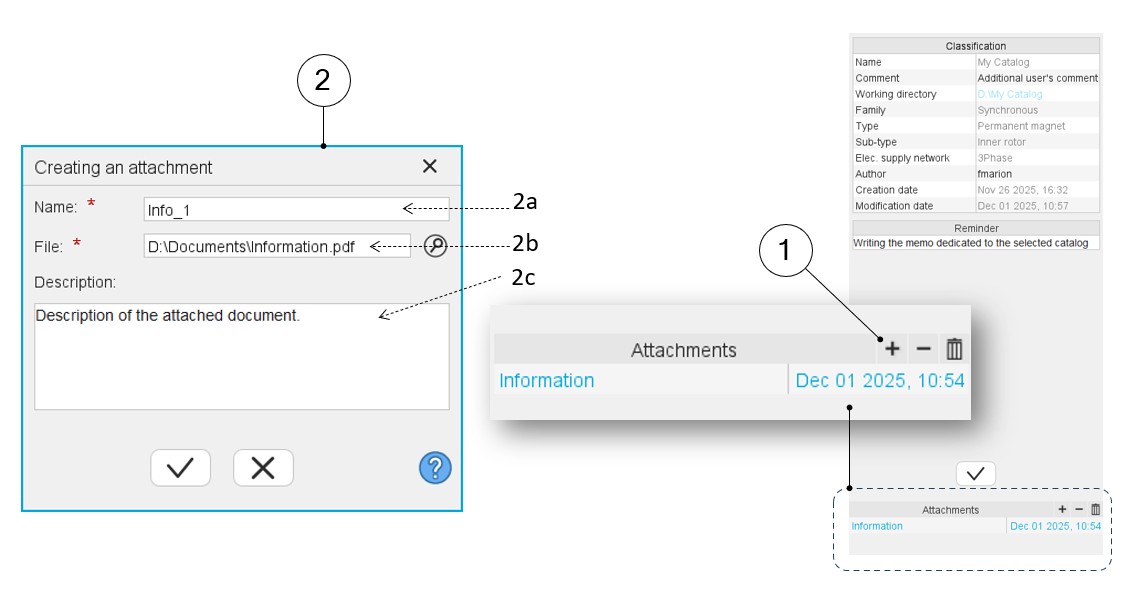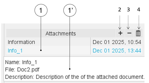 | 1 | Selection of an attached document. Once selected, a tooltip (1’) reminds the name and the description of the selected document. |