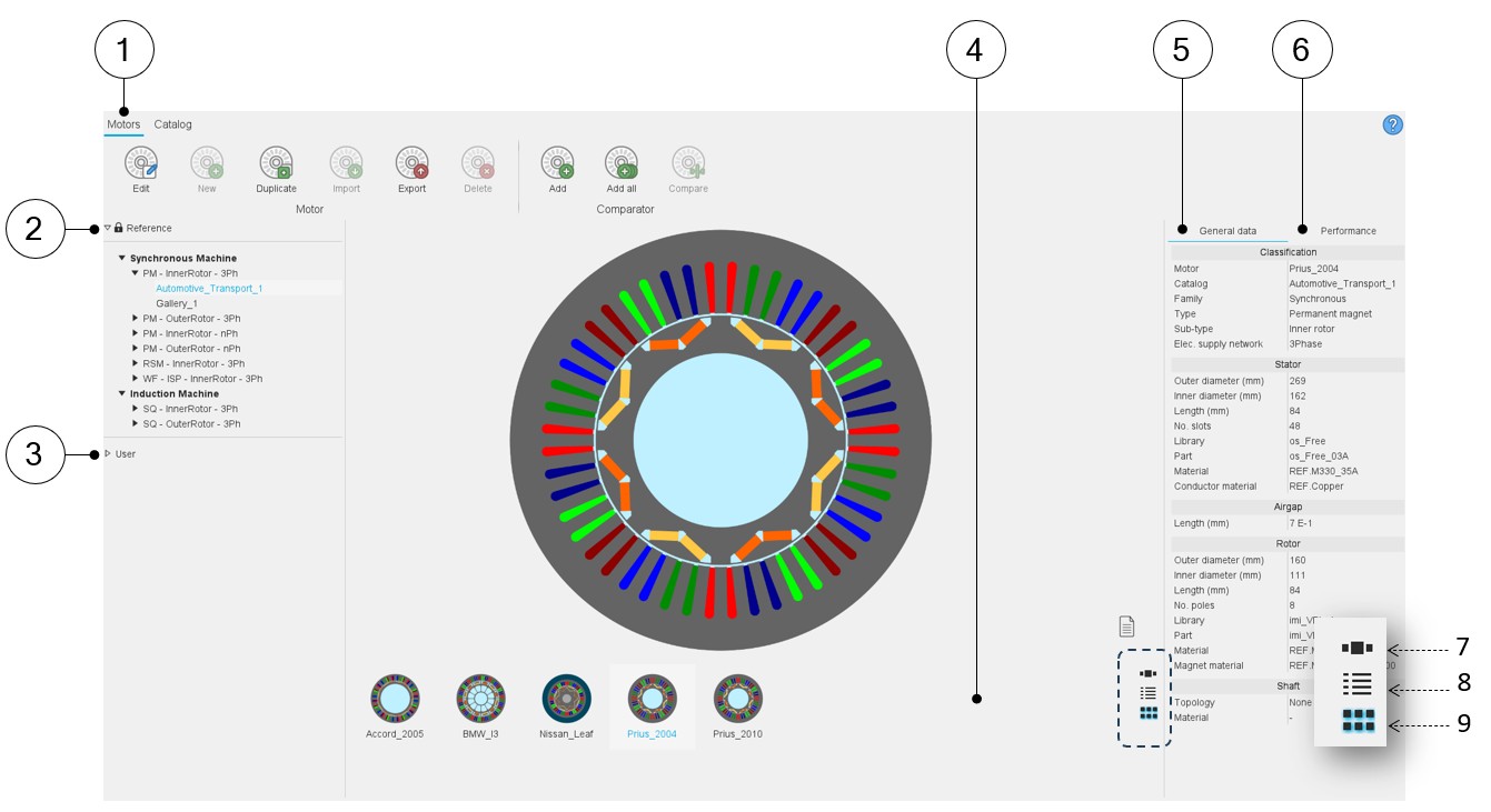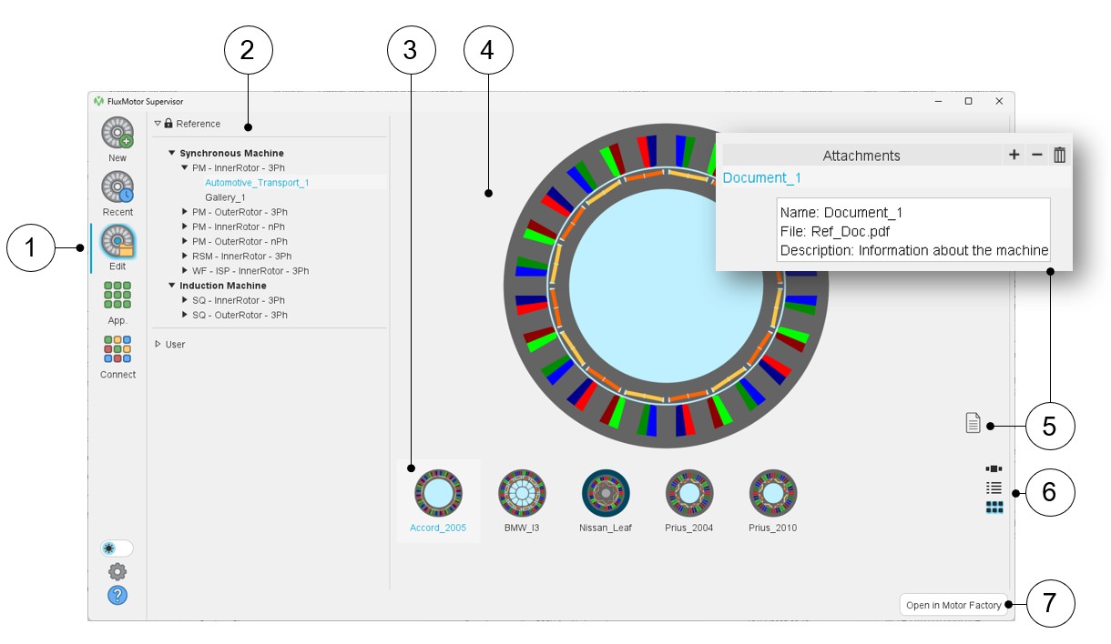 1 Select the button “Edit an existing motor via Motor Catalog”. 2 Selection of the catalog type: Reference or User catalog in which are available catalogs of motors. 3 List of motors stored in the selected catalog. 4 Picture of the selected motor. 5 Button to visualize the attached documents (if there are any). Note: Documents can be attached only from the Motor Catalog application and for the user catalogs.6 Button to display thumbnails as a slide show, as a list or as a matrix view of pictures. 7 Once selected the motor can be opened in Motor Factory either by double clicking on the corresponding line or by clicking on the button “Open in Motor Factory”. A selection tree allows visualizing the machines and selecting them in a more user-friendly way.