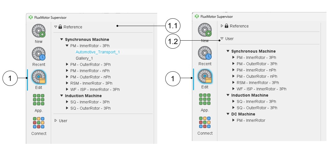 1 “Edit”: To select and edit a project from the catalogs, standard and user catalogs, like what can be done when using Motor Catalog. 1.1 The reference catalogs have been selected and are deployed, and others (User) are folded. 1.2 The user catalogs have been selected and are deployed, and others (Reference) are folded. - Full access to Motor Catalog: