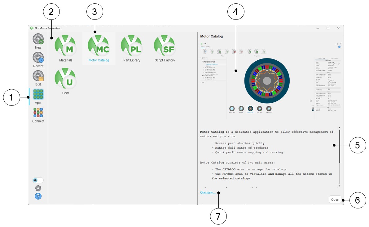 1 Select the button to access FluxMotor applications. 2 Icons of FluxMotor applications (Materials, Motor Catalog, Part Library, Script Factory, Units). 3 Selection of the application “Motor Catalog”. 4 Picture of the selected application: Motor Catalog in our example. 5 A short description of the selected application. 6 Once selected, the application can be opened either by double clicking on the corresponding icon or by clicking on the button “Open”. 7 A link “Overview” to reach the online user help guide, which described the selected application.