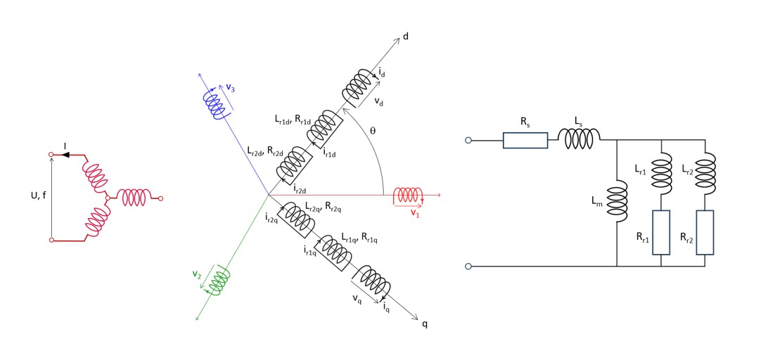Then, the resulting equivalent scheme can be evaluated by simulating the starting of the considered induction machine. The speed, torque and absorbed current versus time are computed and displayed.