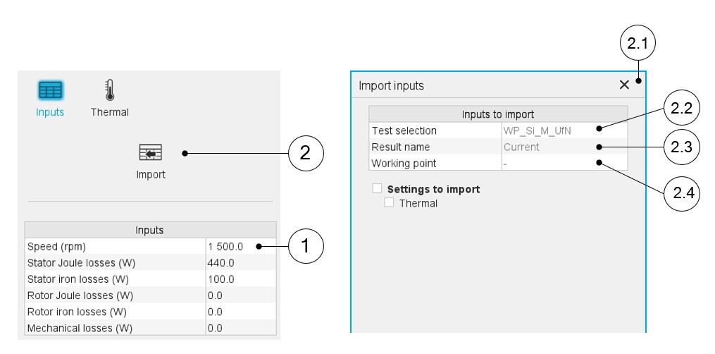 The set of inputs can be imported from another test already performed in Motor Factory Test environment.