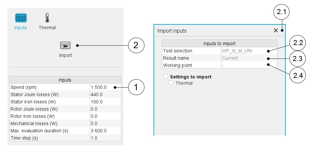 The set of inputs concerning the speed and the losses, can be imported from another test already performed in Motor Factory Test environment.