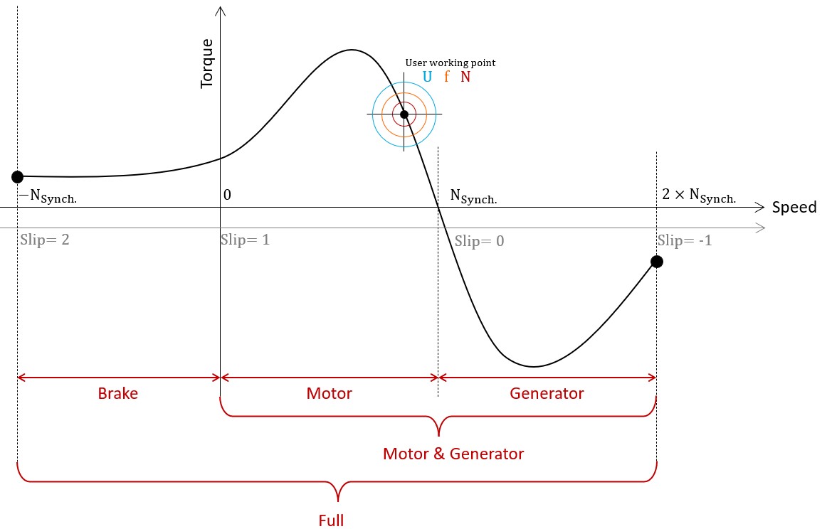 The aim of the test “Performance Mapping – Sine wave – Motor – T(Slip)” is to characterize the behavior of the machine when operating over a speed range corresponding to a targeted operating mode (“Motor”, “Generator”, “Brake”, “Motor & Generator”, “Motor & Brake” and “Full”). This also corresponds with the operating magnitude of line-line voltage (U) and power supply frequency input values (f).