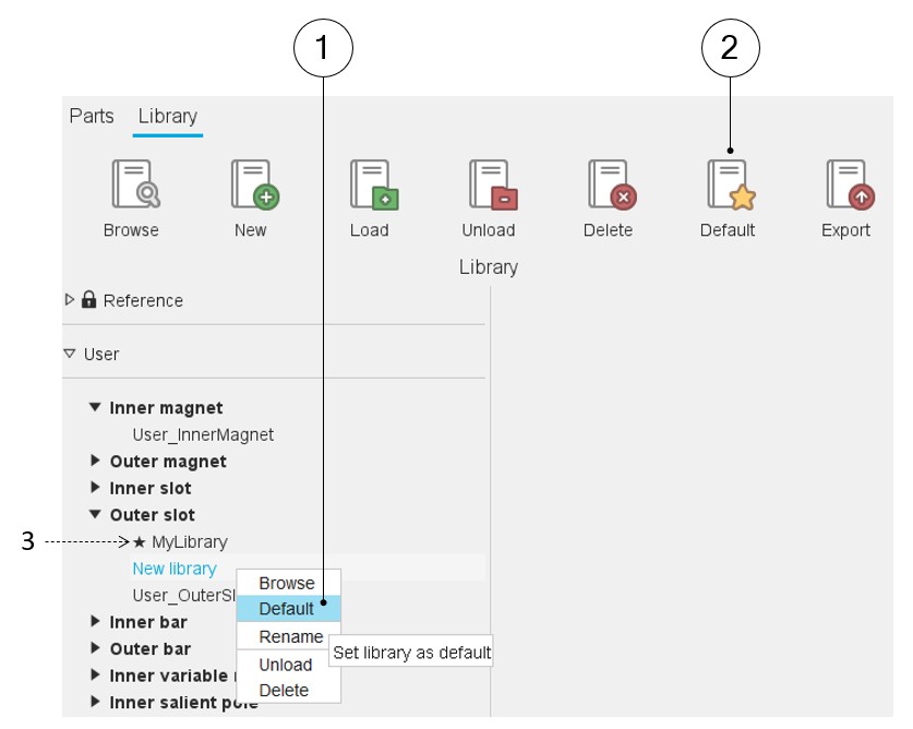 Setting a library as a favorite allows opening this library first, from the Design area of Motor Factory when changing the topology of part (Slot, magnet, bar, saliency, pole)