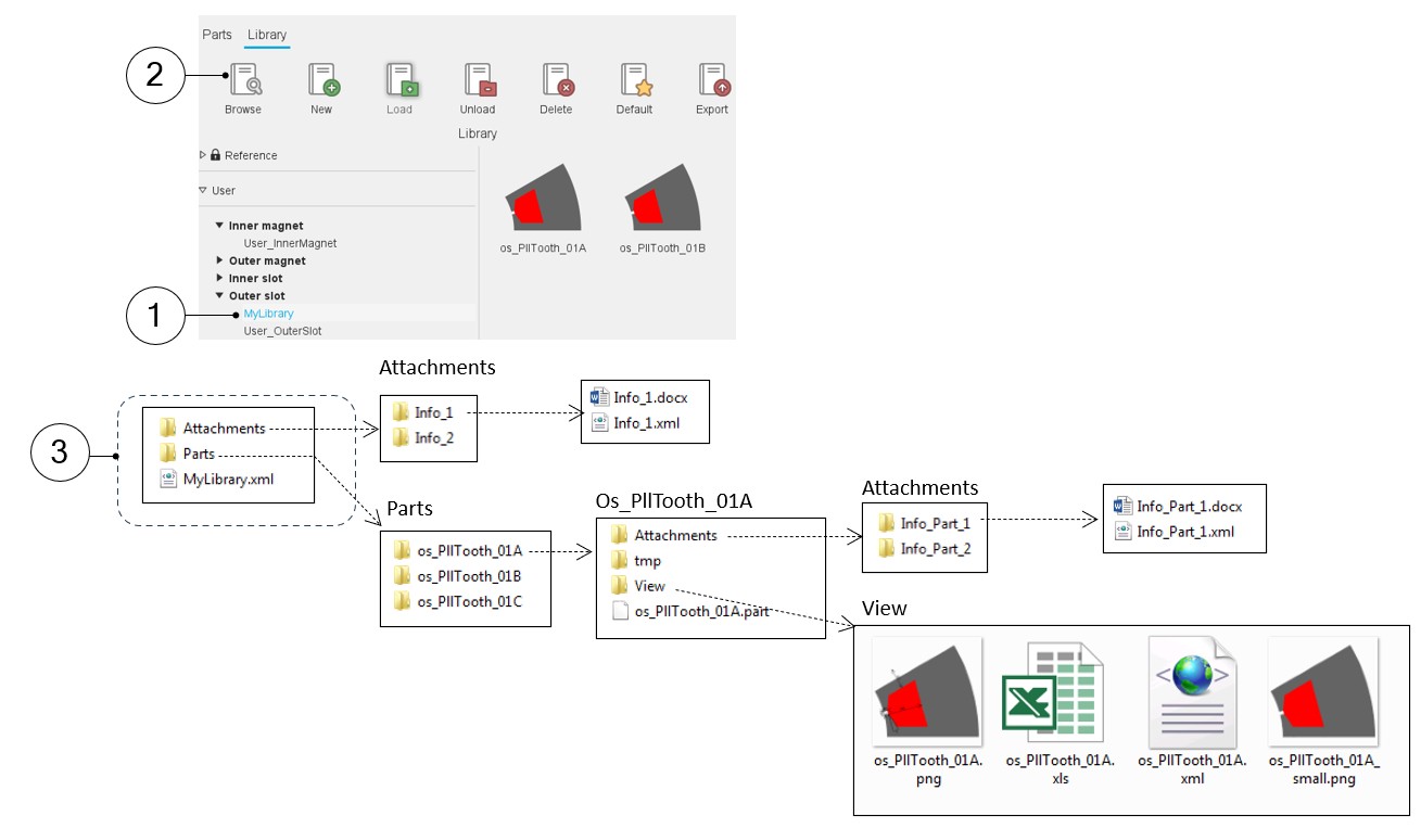 | 3 | Content of the folder “MyLibrary”: Two folders’ “Attachments” and “Parts” + one xml file: MyLibrary.xml. Note: In the folder “Attachments” there are all