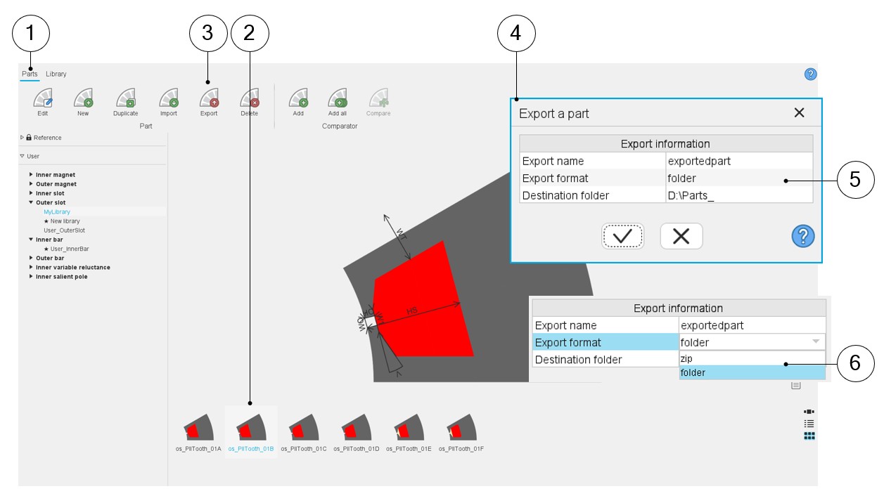 | 3 | Clicking on the icon “Export” opens a dialog box to export parts stored in a folder or in a zip file. |