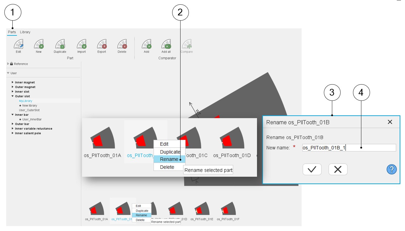 | 3 | The dialog box is opened to allow renaming of the selected part. |