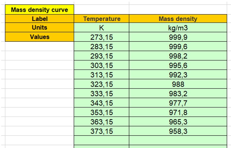 Here is the process to define the liquid thermal characteristics from the importation of a series of points representing the considered quantity curve listed in an Excel file. In the following example water mass density is considered; however, the same principle is applied for all other liquid thermal quantities, which are defined below.